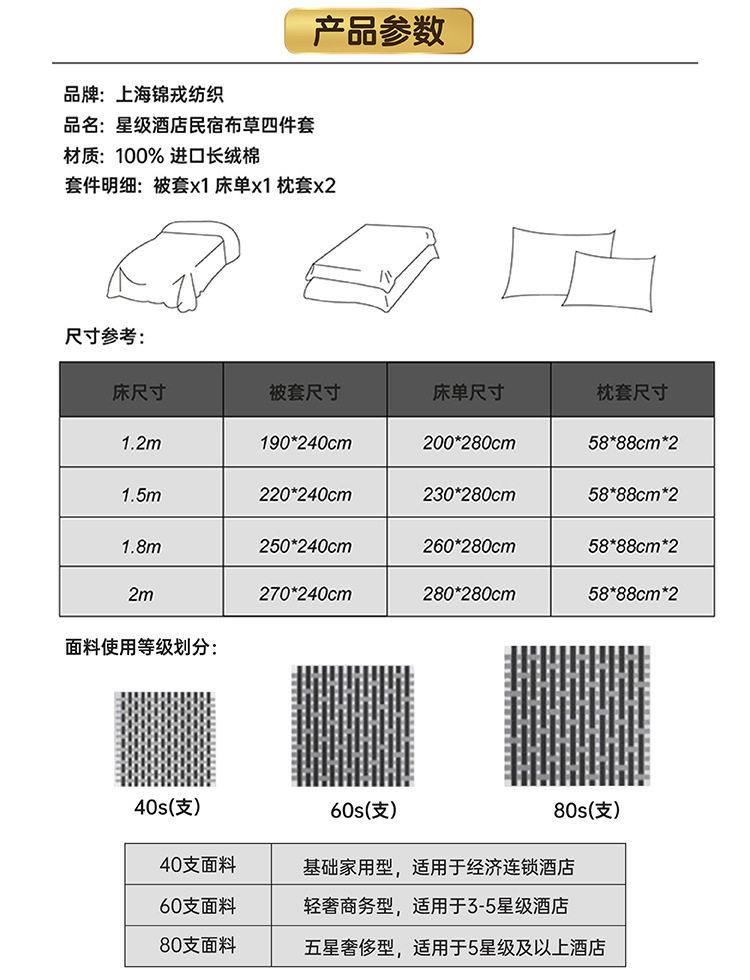 酒店因经常送洗,洗涤温度较高,所以我们纯棉面料都会预留缩水量,根据不同面料预留了5%-6%,新布草由于未洗涤,内径长宽各大10~15CM属正常,可放心使用;洗涤几次尺寸即可稳定。