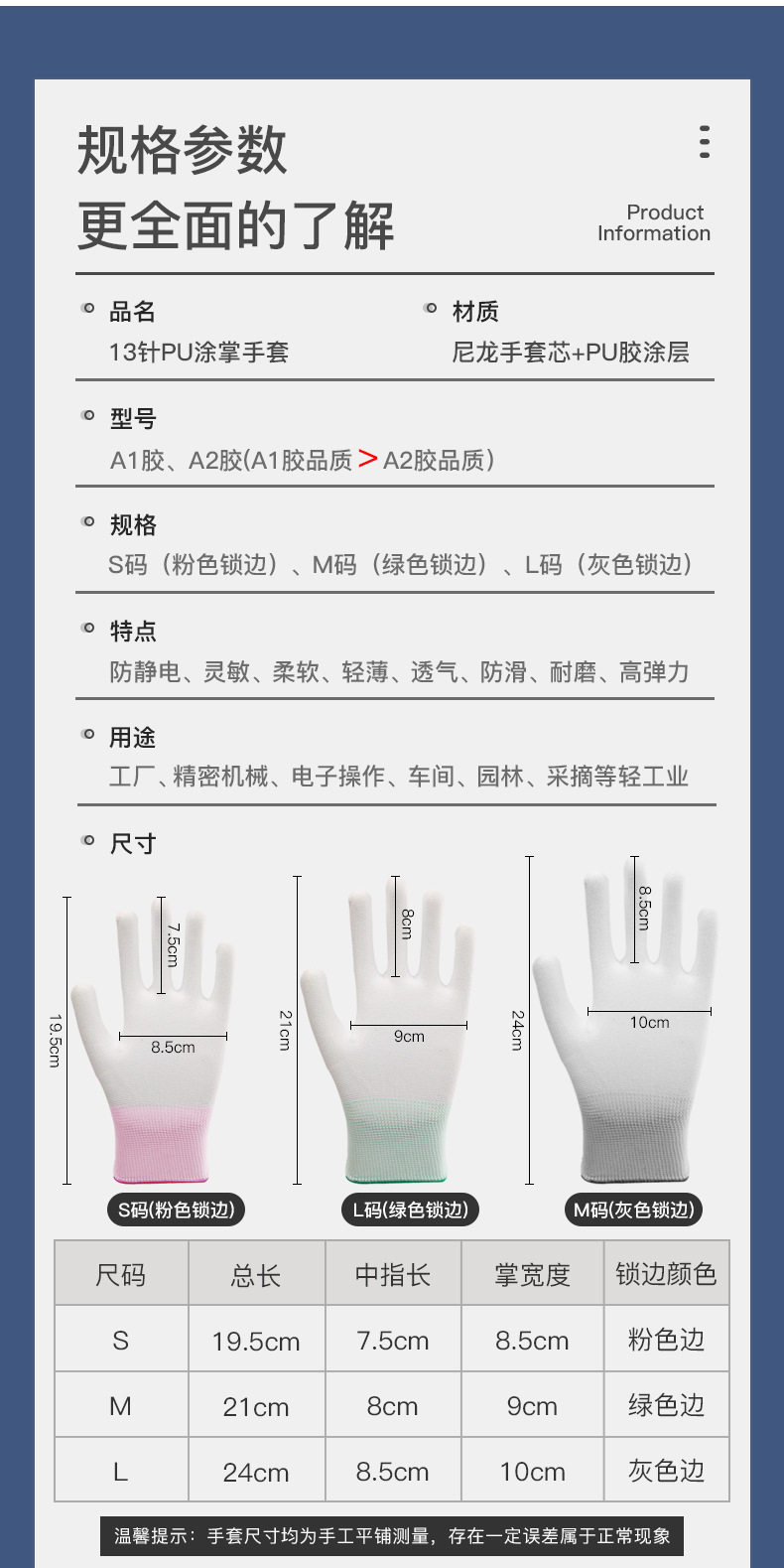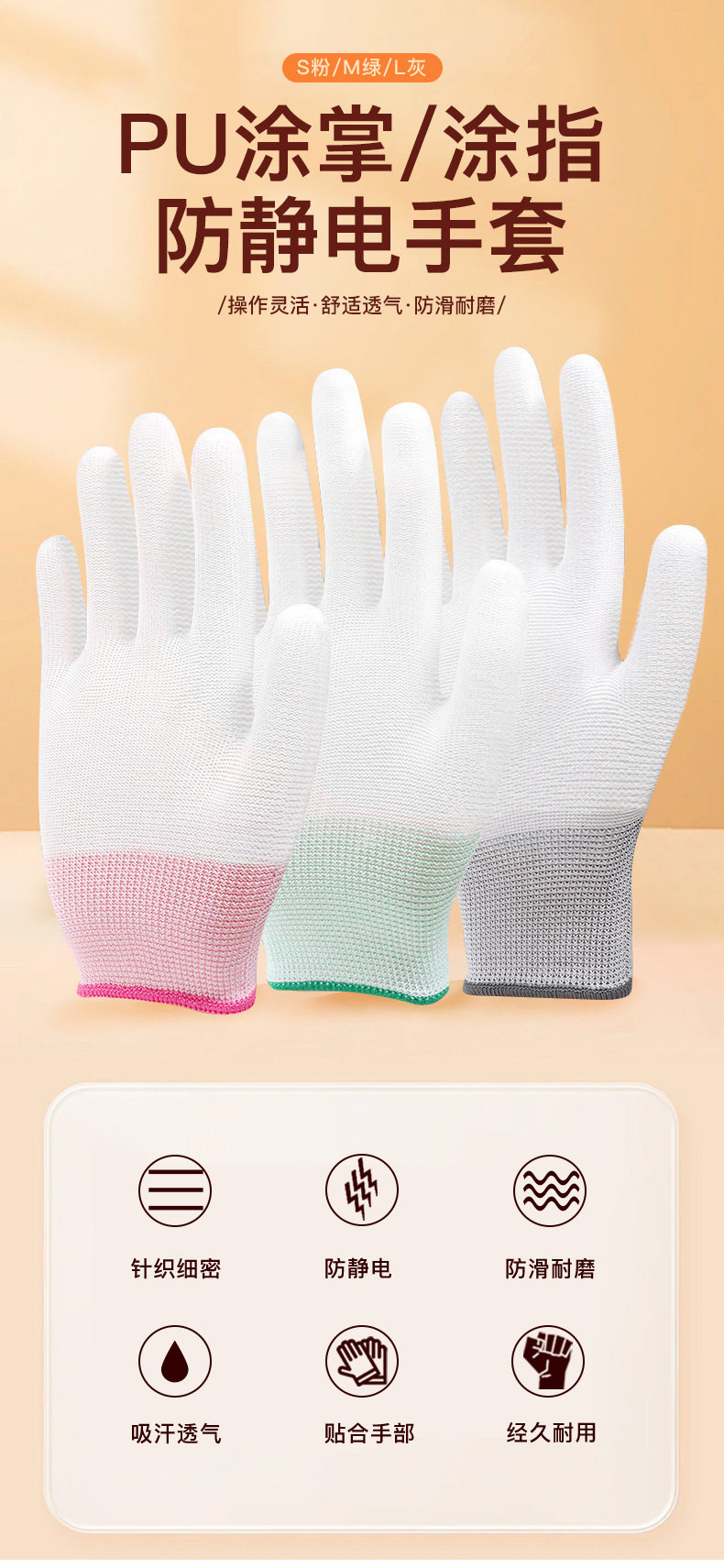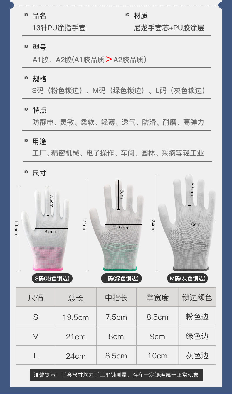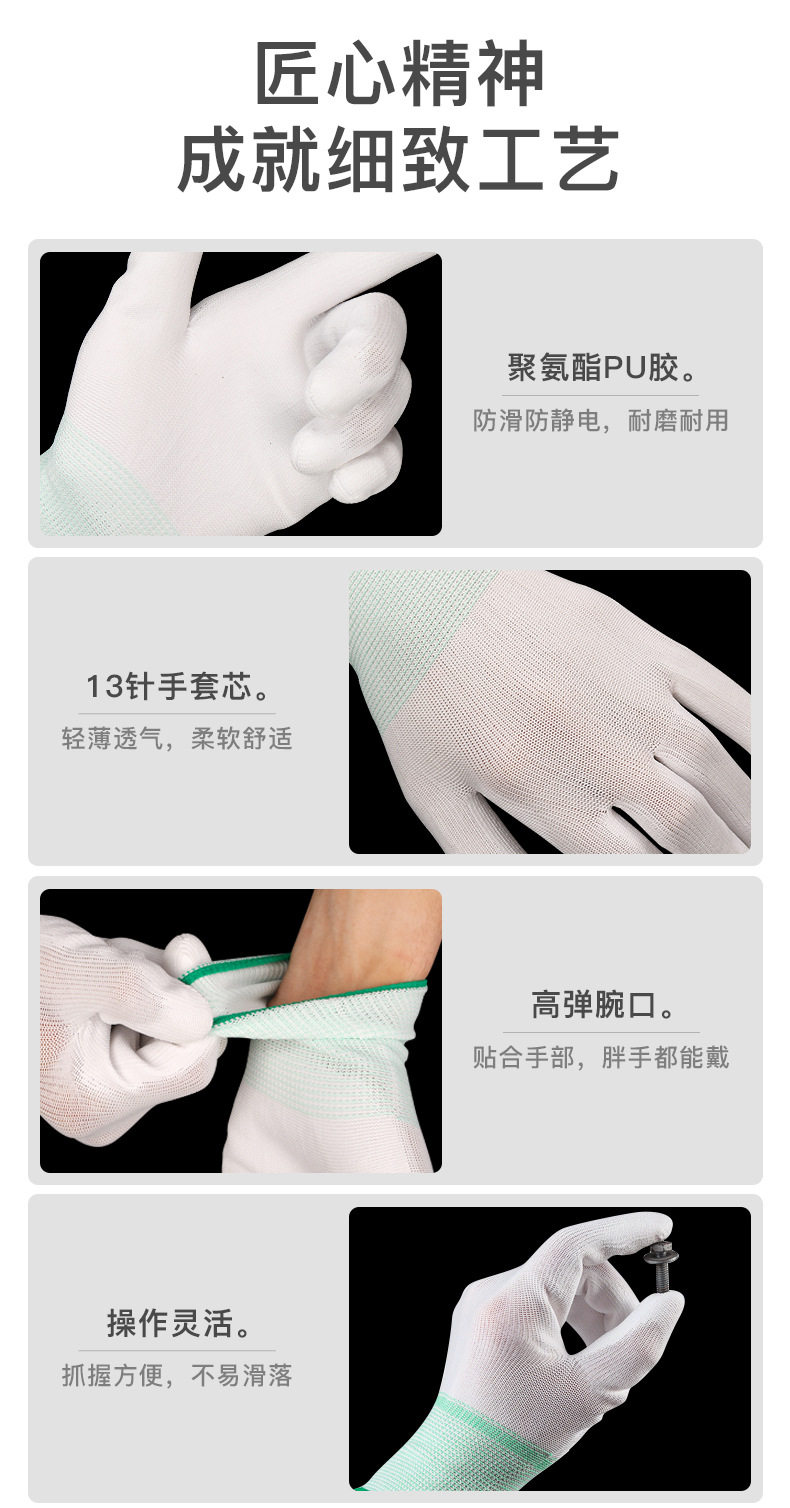 PU手套涂掌涂指13针加厚防滑防静电电子工作无尘透气劳保涂层手套
