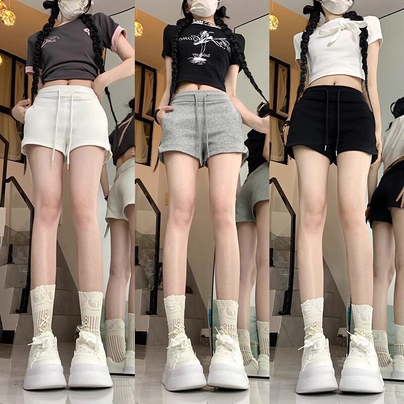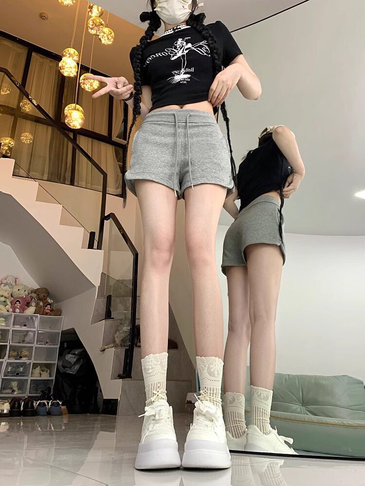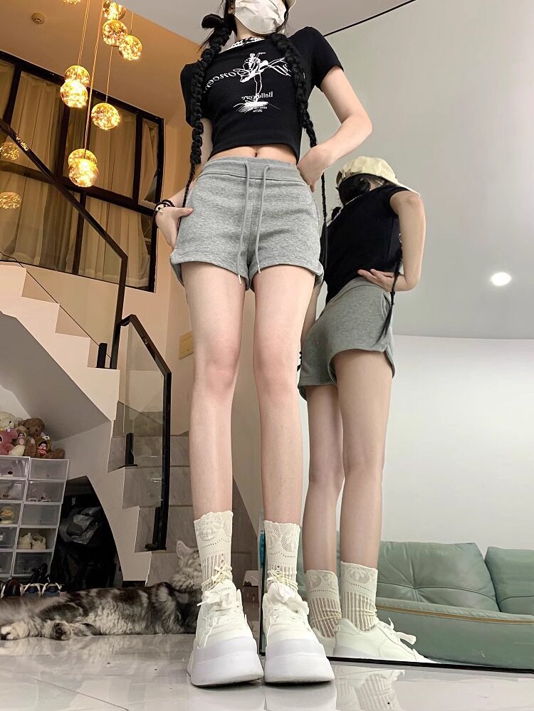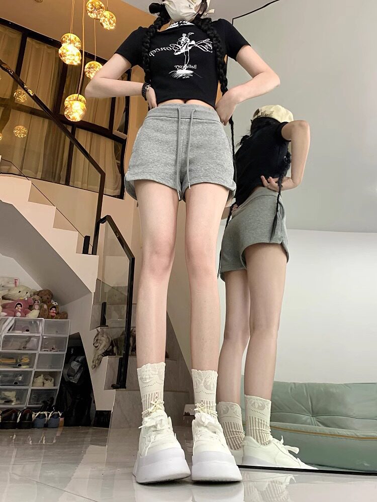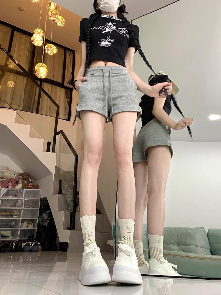 美式辣妹灰色运动短裤女2024年夏季百搭高腰显瘦绑带小个子休闲裤