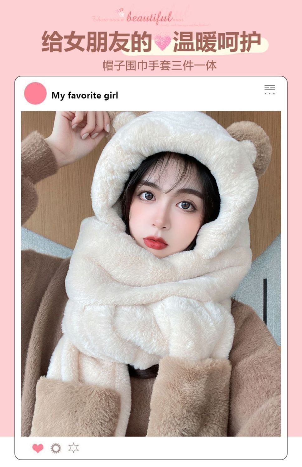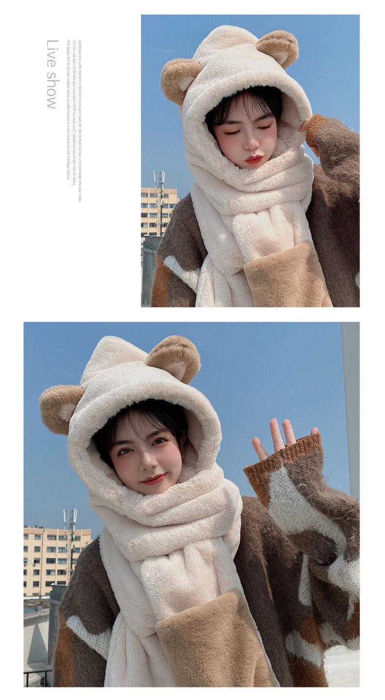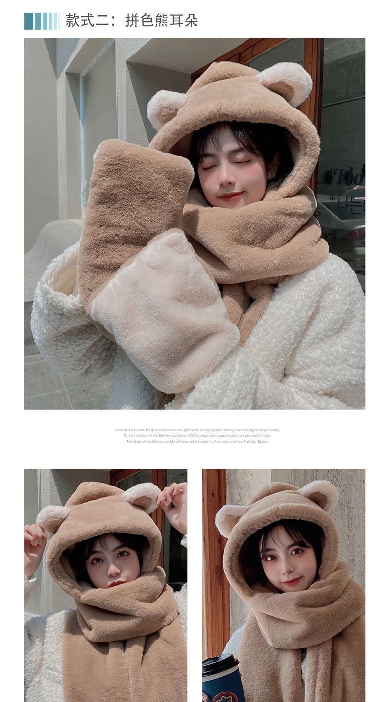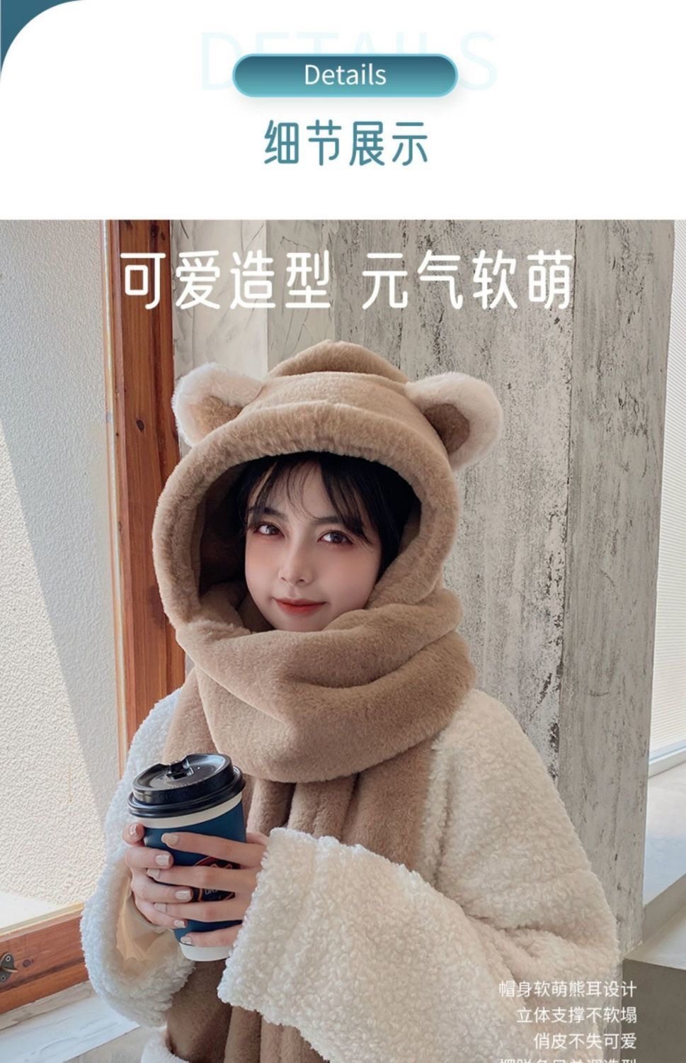 兔绒帽子女2024新款冬可爱小熊骑行保暖围巾一体帽百搭加绒围脖