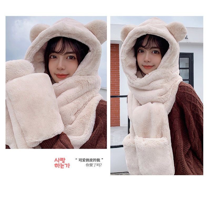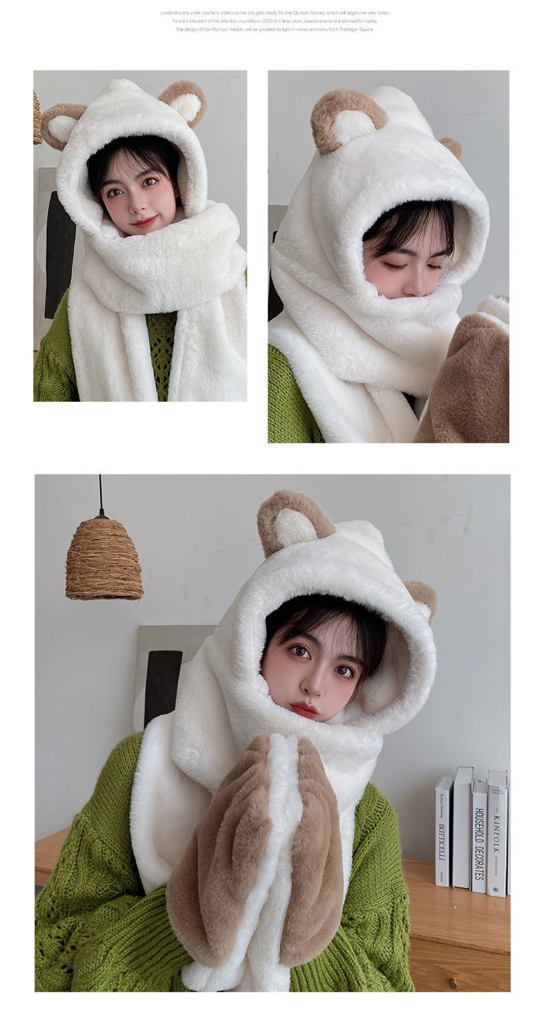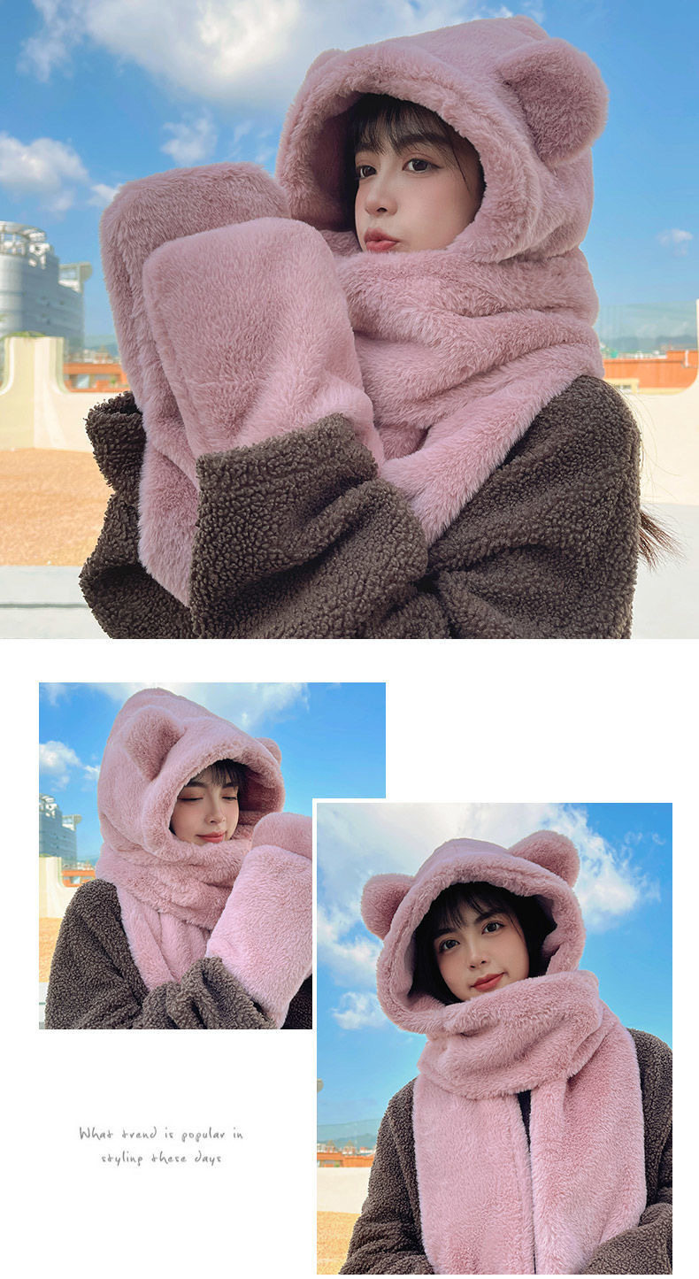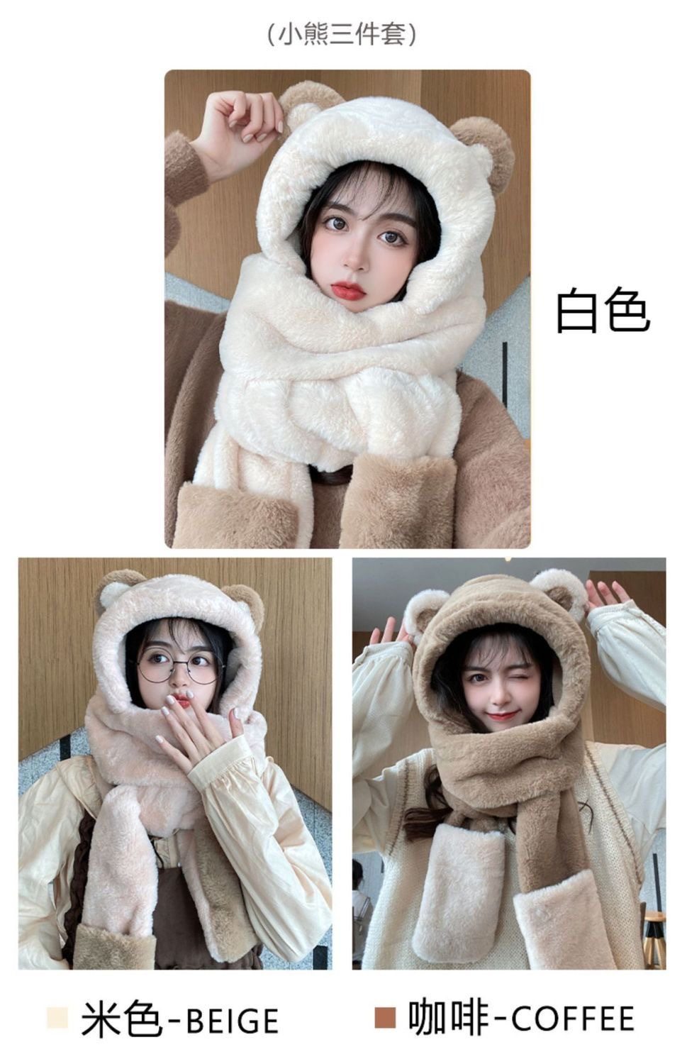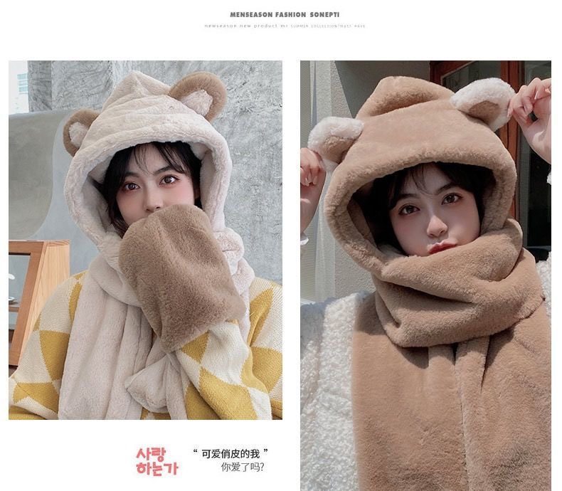兔绒帽子女2024新款冬可爱小熊骑行保暖围巾一体帽百搭加绒围脖