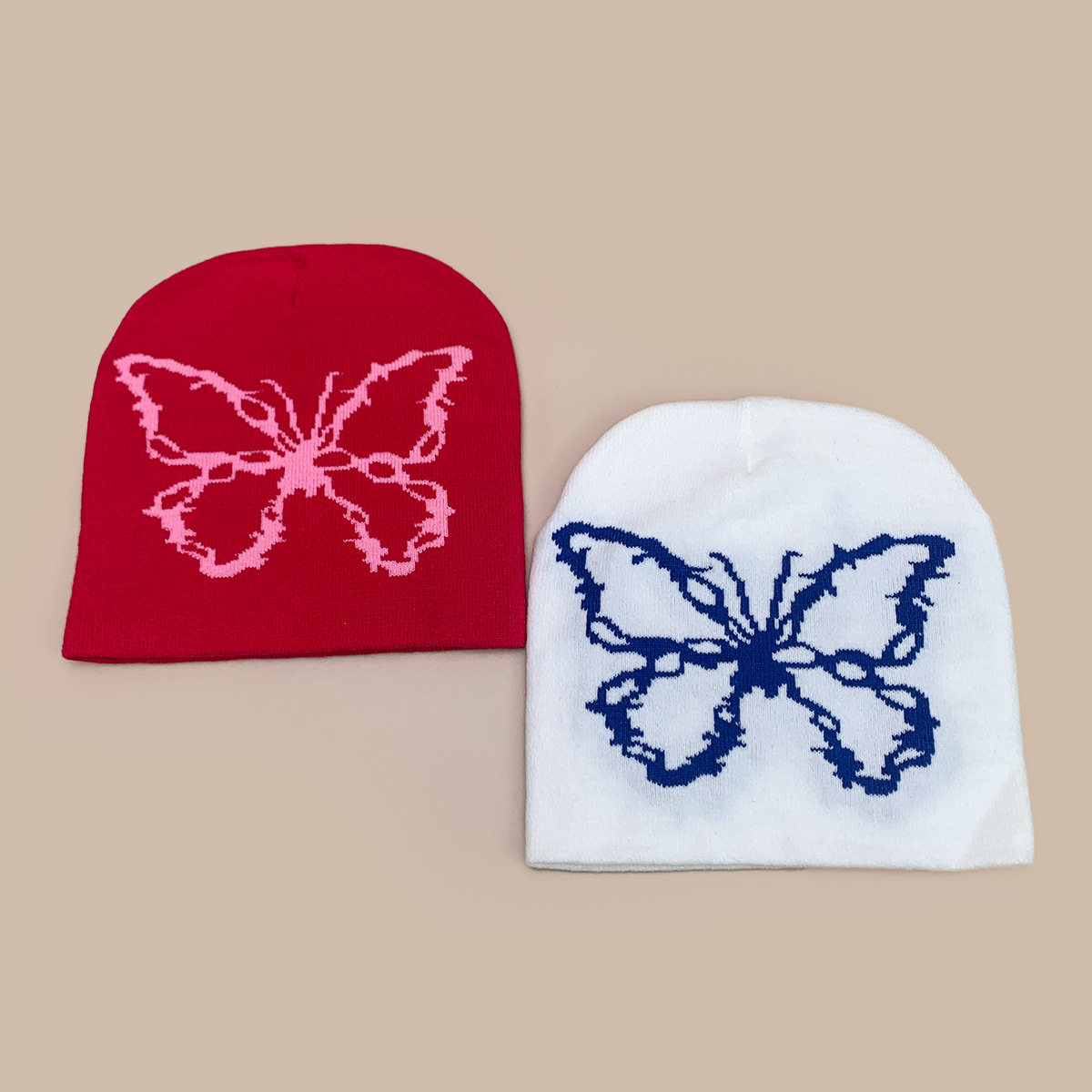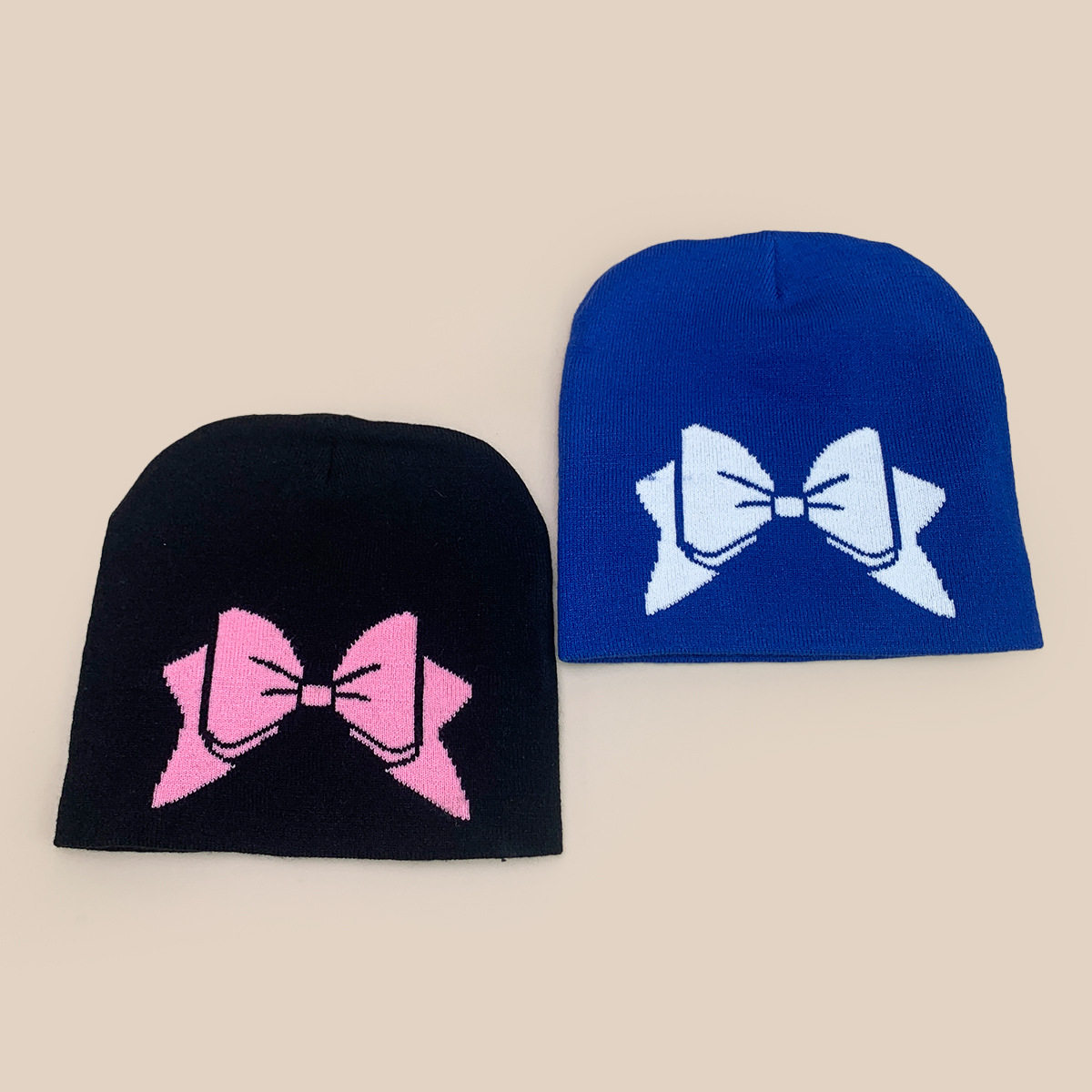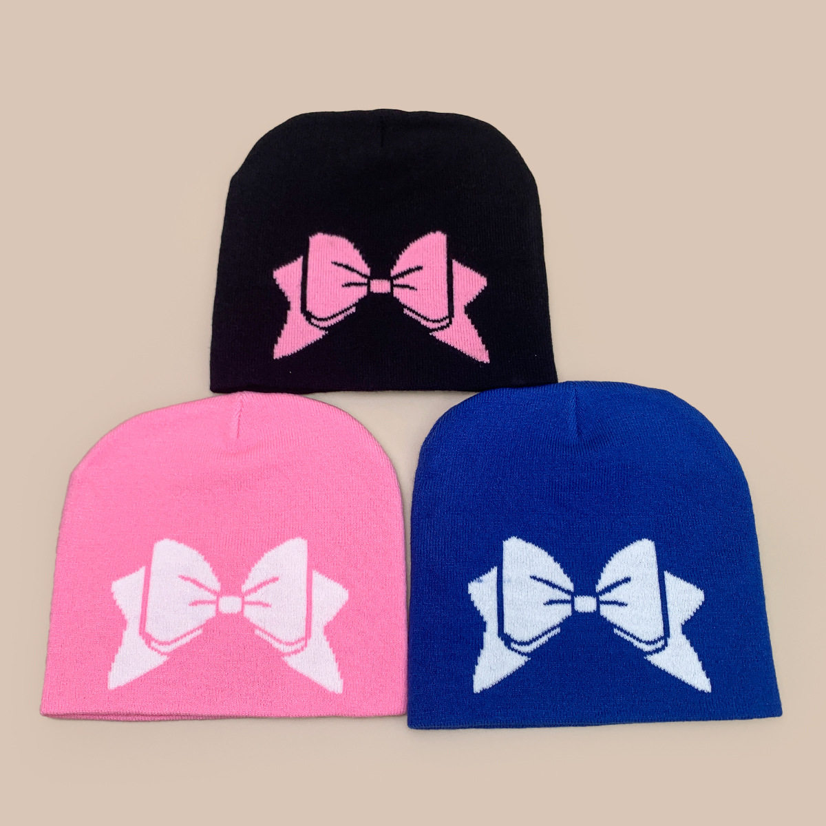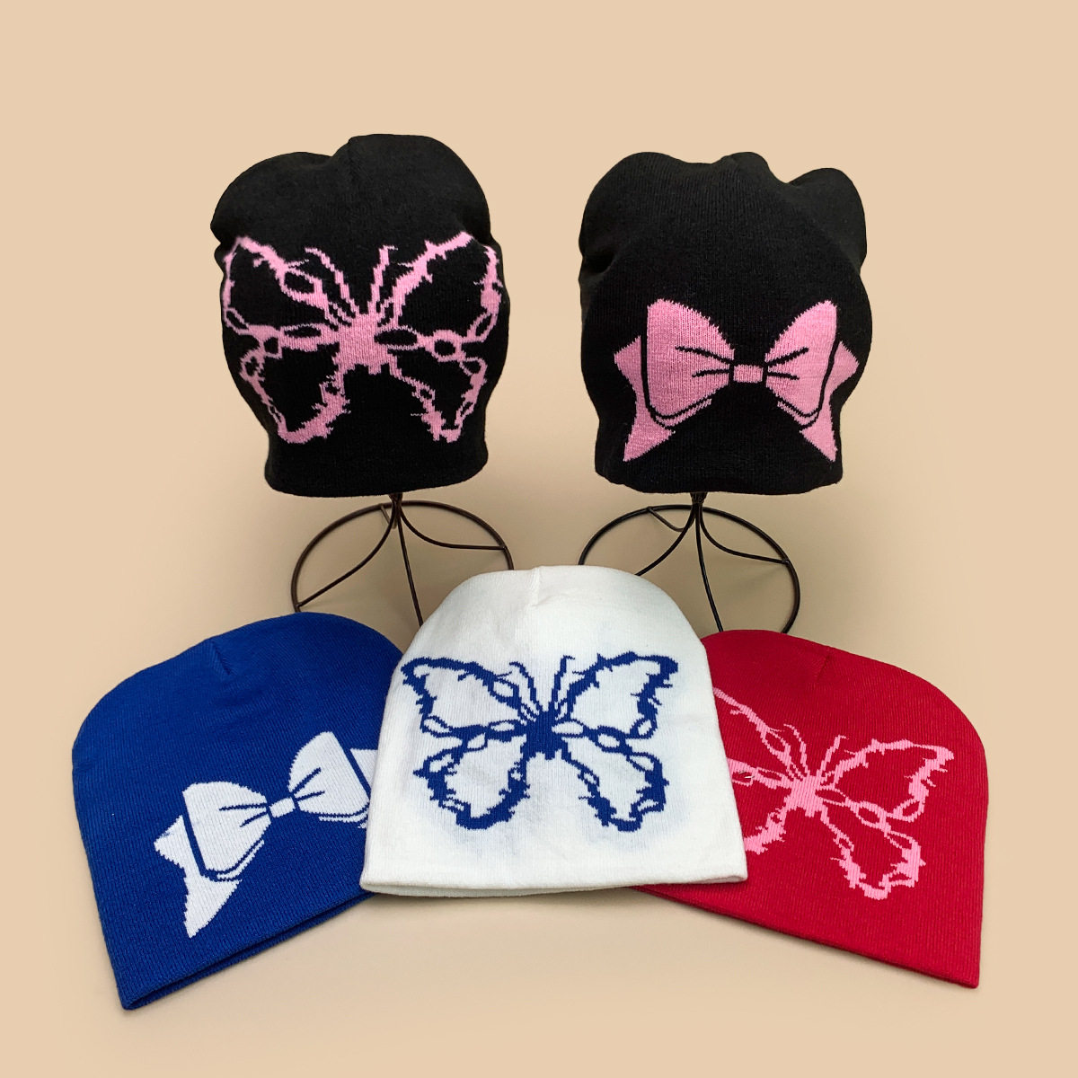韩版蝴蝶结蝴蝶提花针织帽女士保暖休闲复古拼色冷帽套头帽子批发