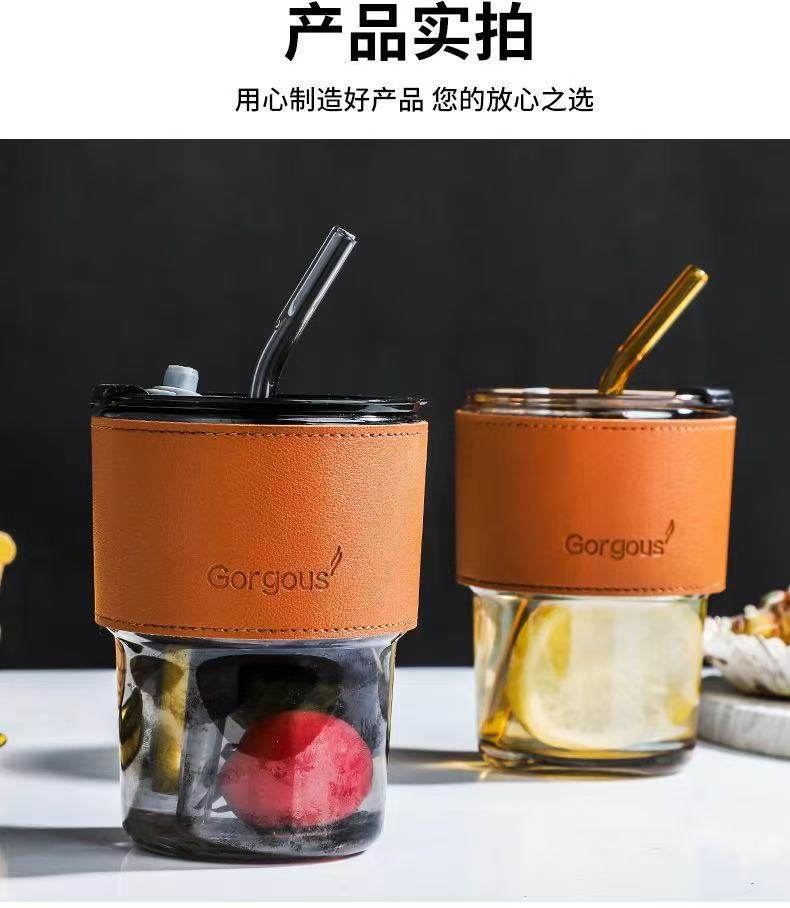 竹节咖啡杯茶色带盖玻璃带吸管杯子随手奶茶双饮水杯便携便携款