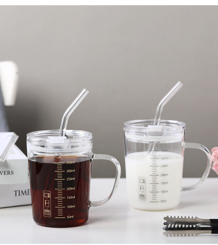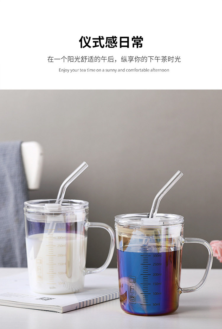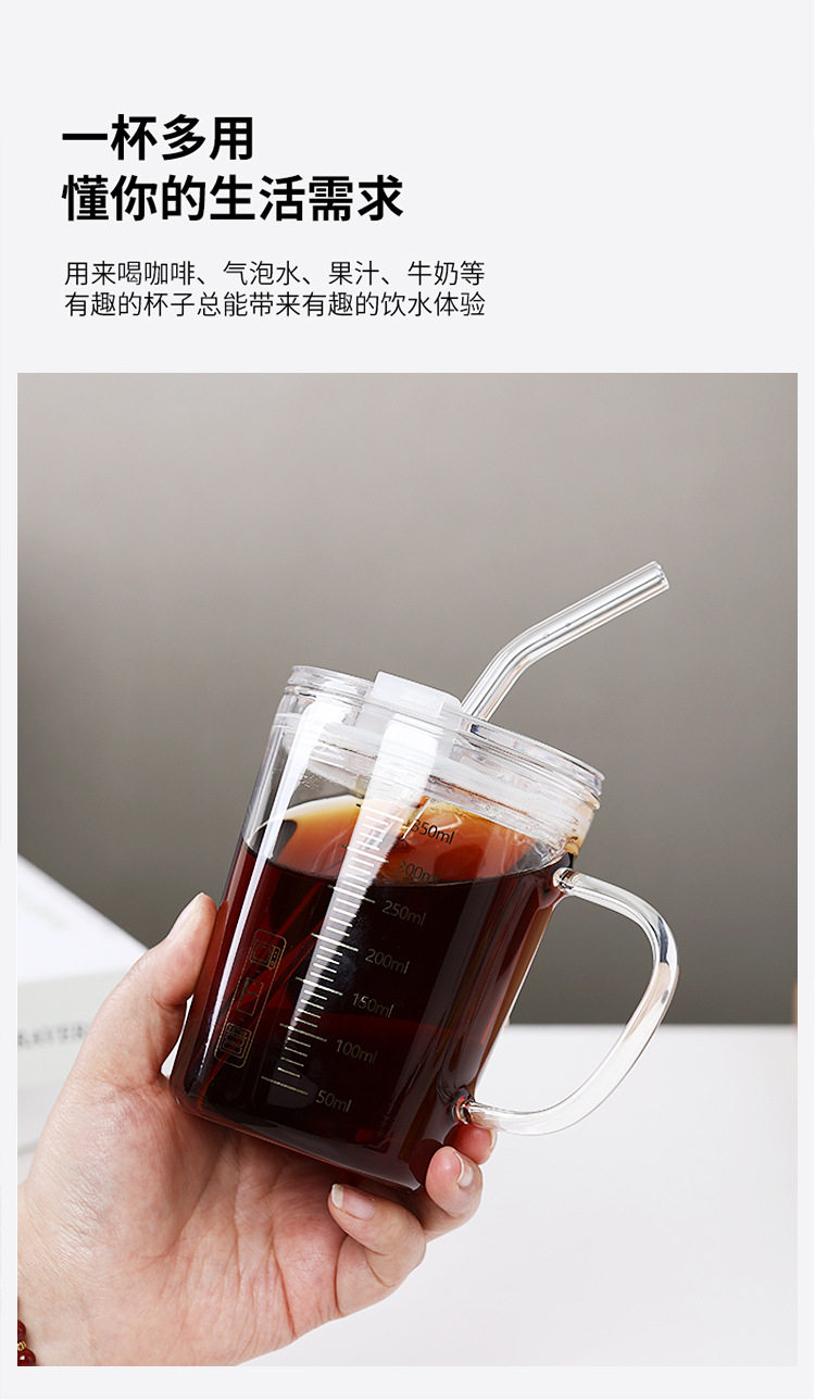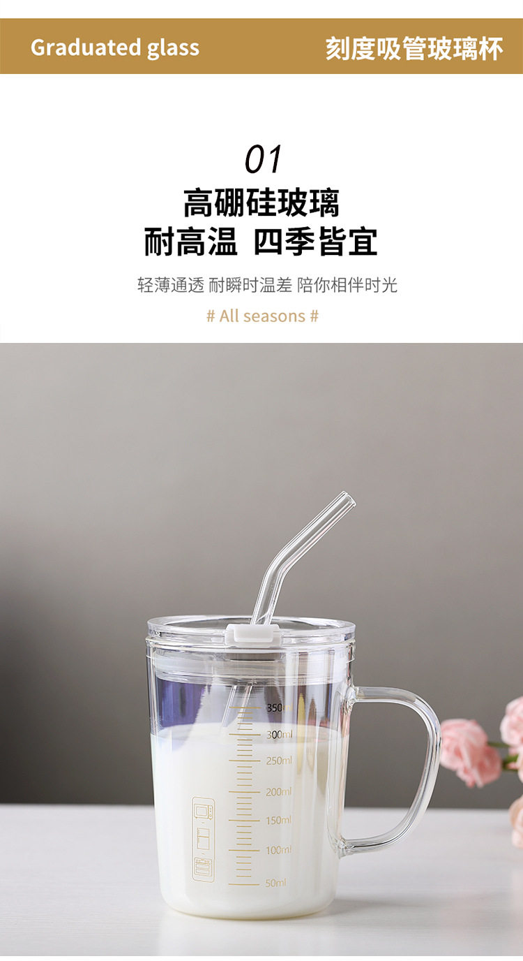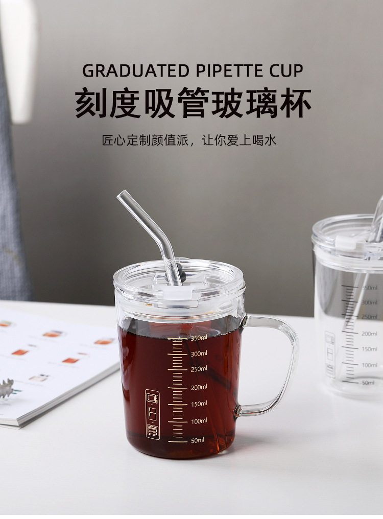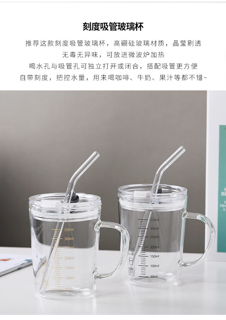 刻度牛奶杯高颜值喝水咖啡杯带盖家用微波炉吸管玻璃杯吸管杯