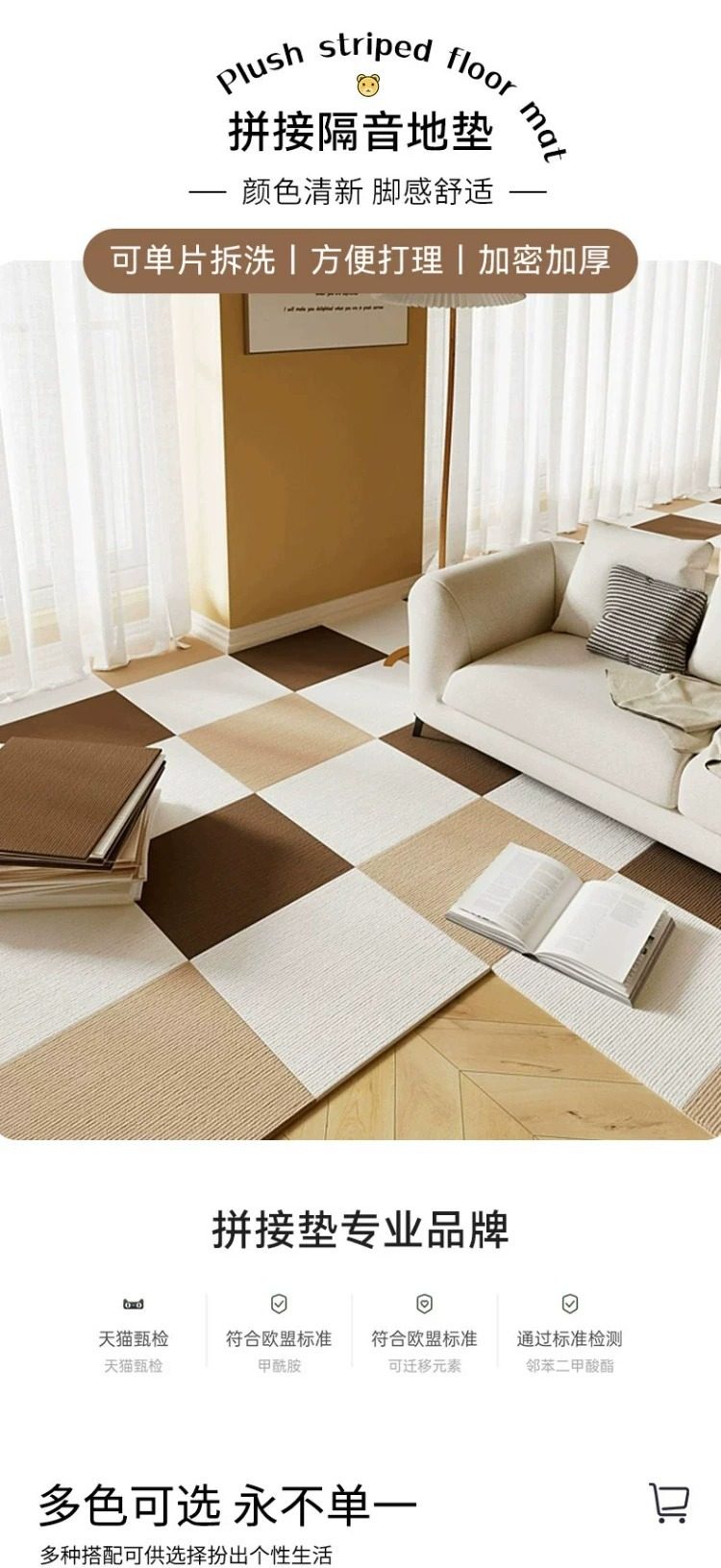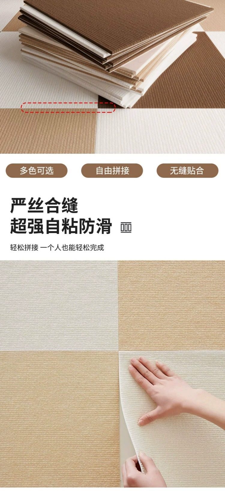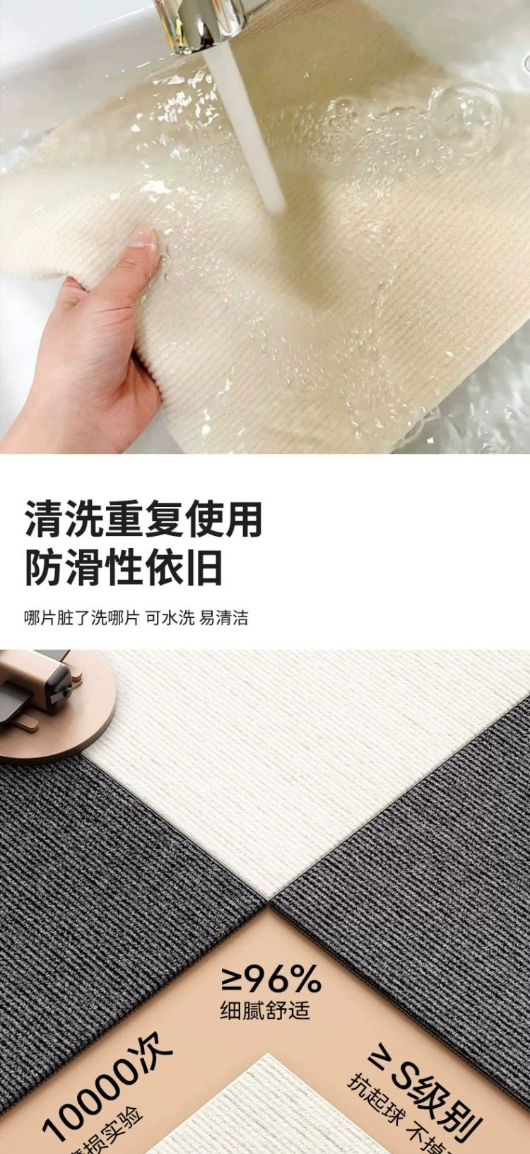 1.自粘背面带胶款优点是适合水泥地与不平整光滑的表面,缺点是不用的时候撕起来可能会有留胶,不能重复使用,背面是银色铝箔。2.免胶吸附款适合平整光滑的表面(光滑的木地板与瓷砖可用),缺点是水泥地与粗糙不平整的面不适合贴,优点是可重复使用,脏了可以取下水洗后重复使用。