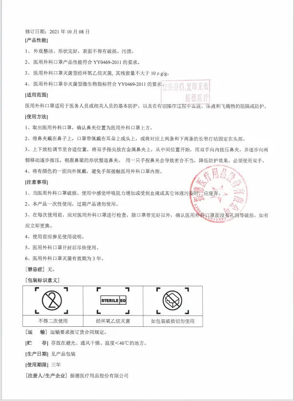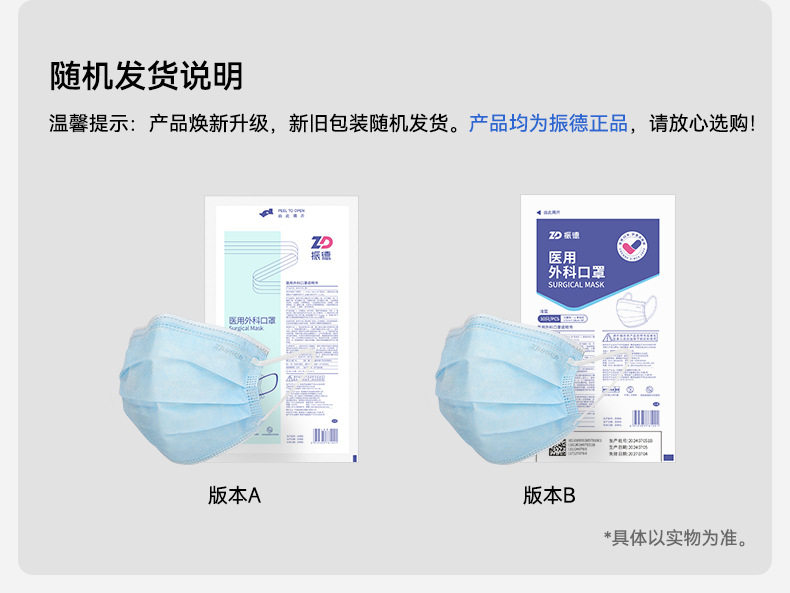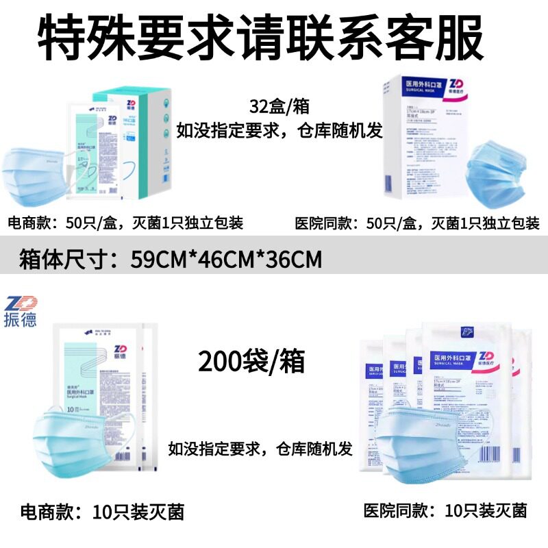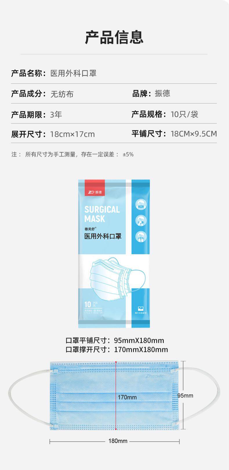 振德一次性医用外科口罩10只装蓝色灭菌三层透气防护口罩纸塑包装