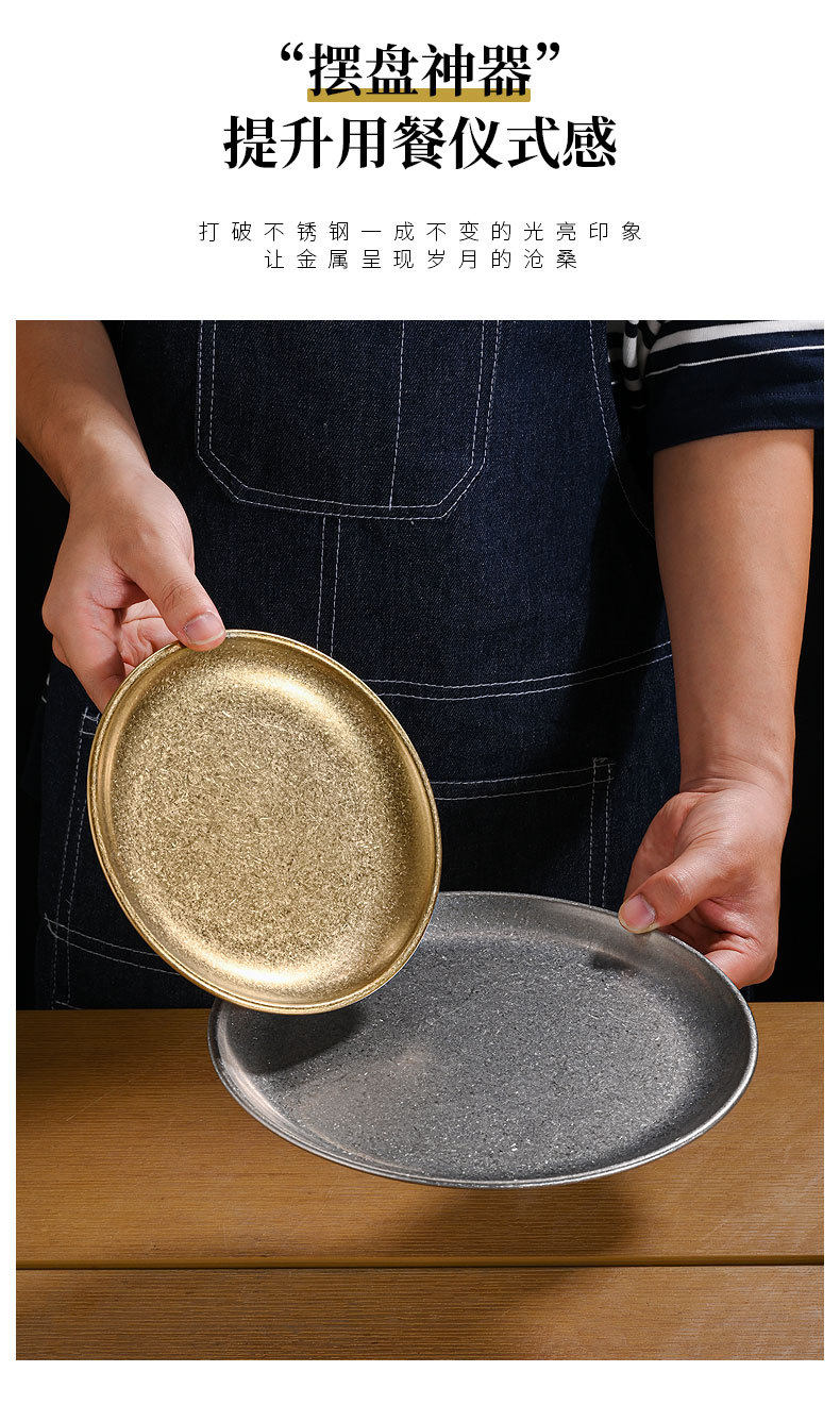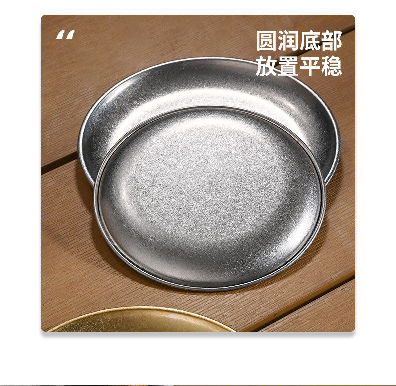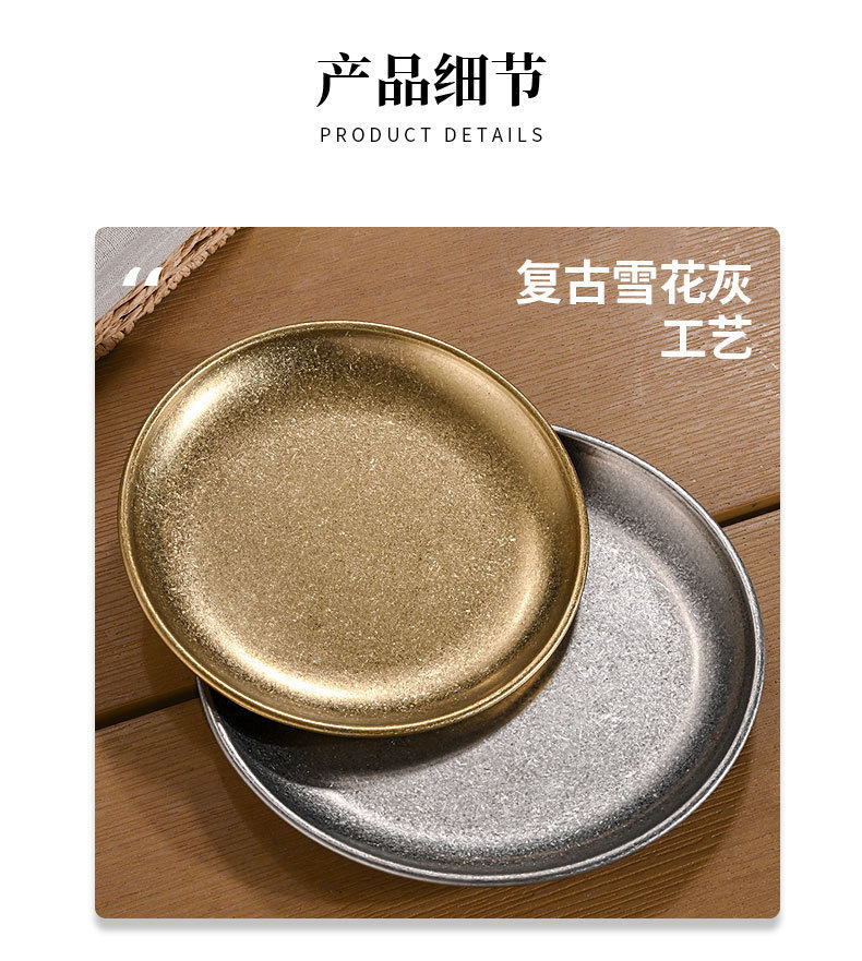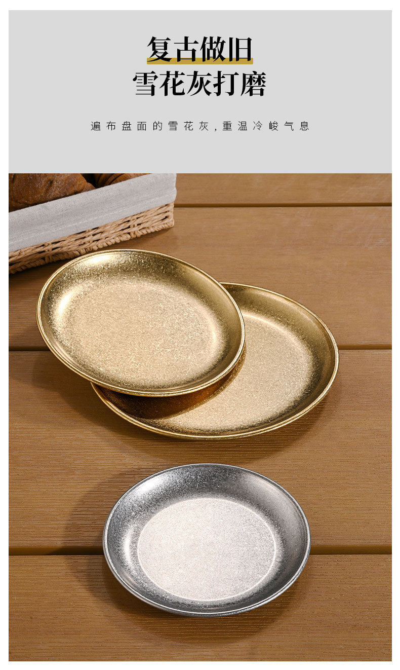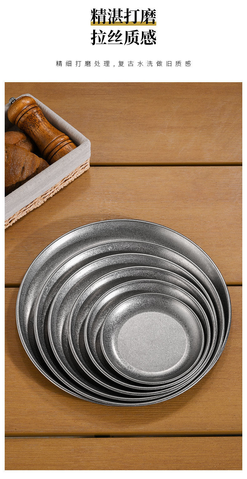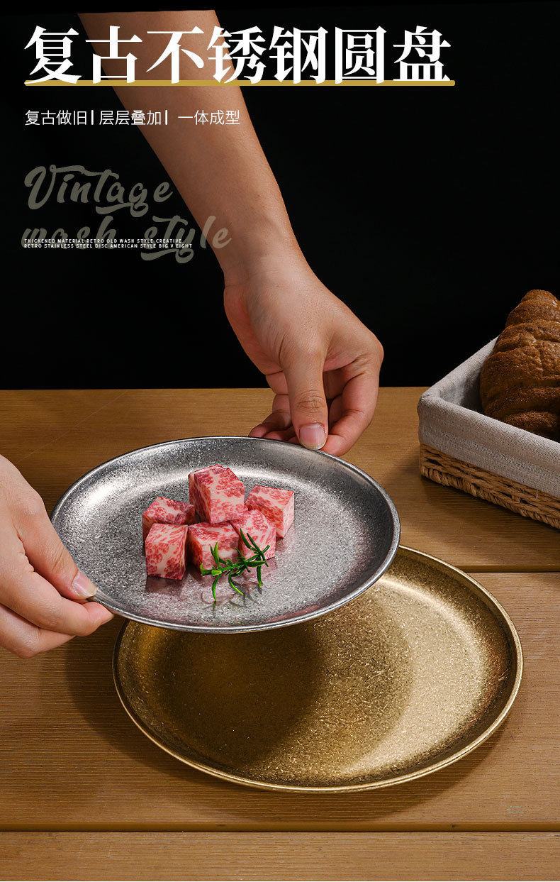 韩式不锈钢圆盘ins做旧咖啡厅托盘水果盘甜品浅盘平底碟复古餐具
