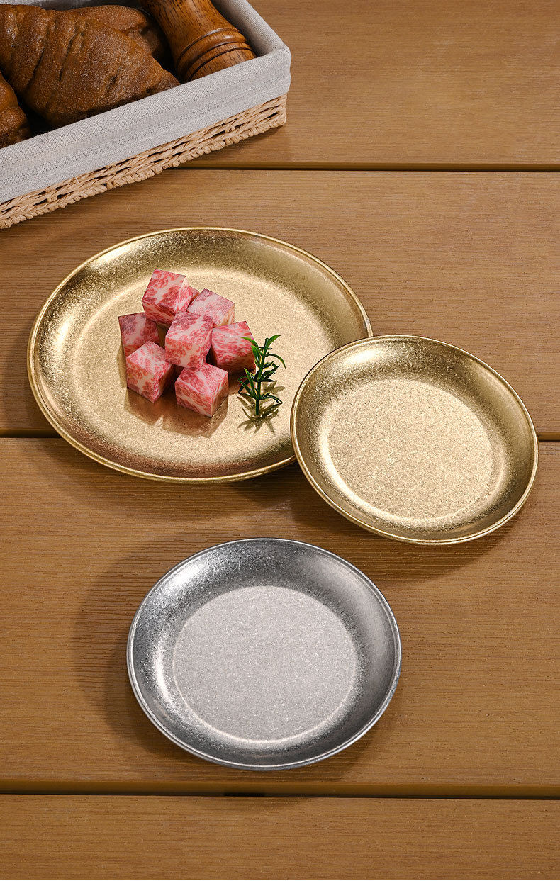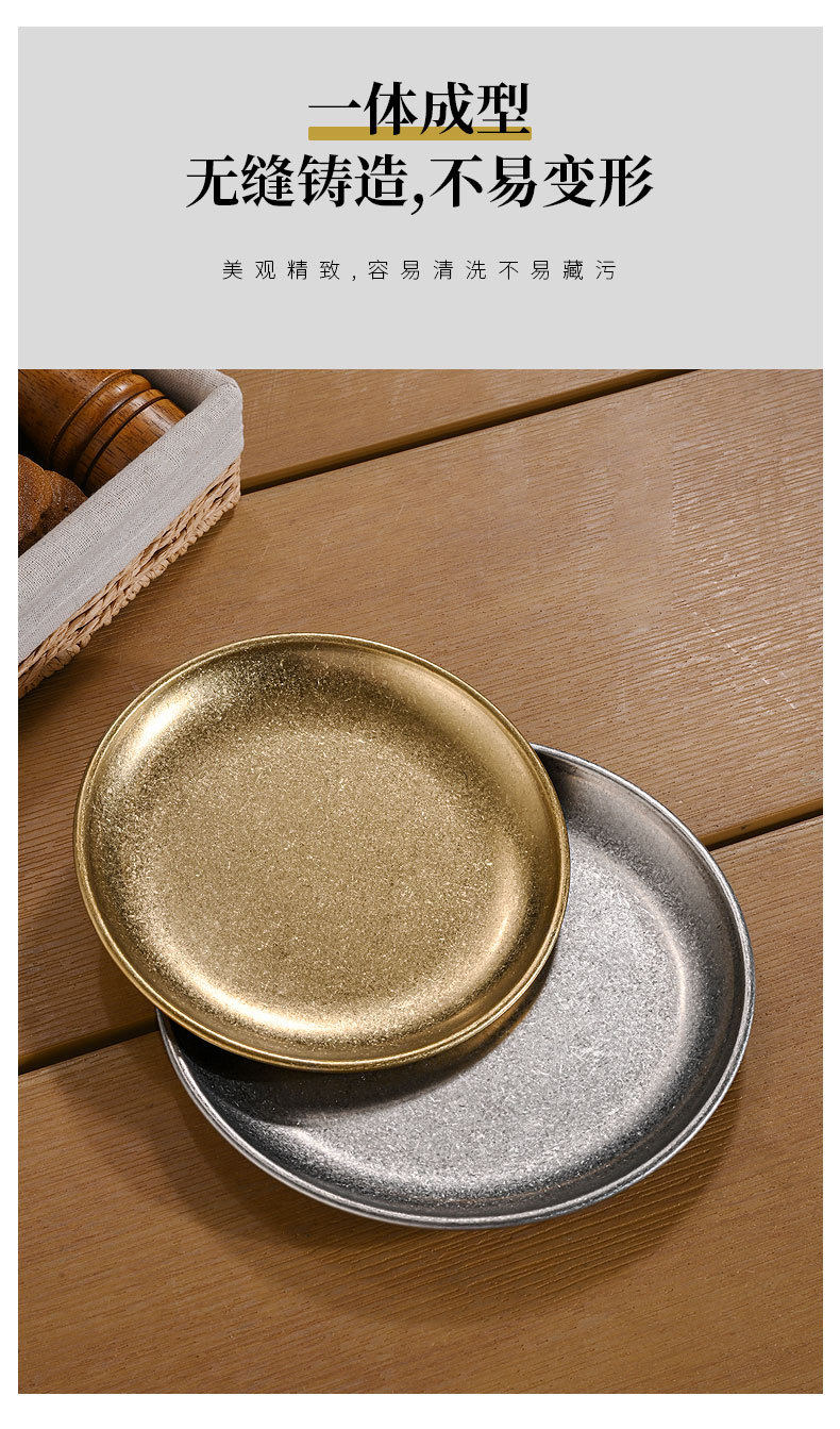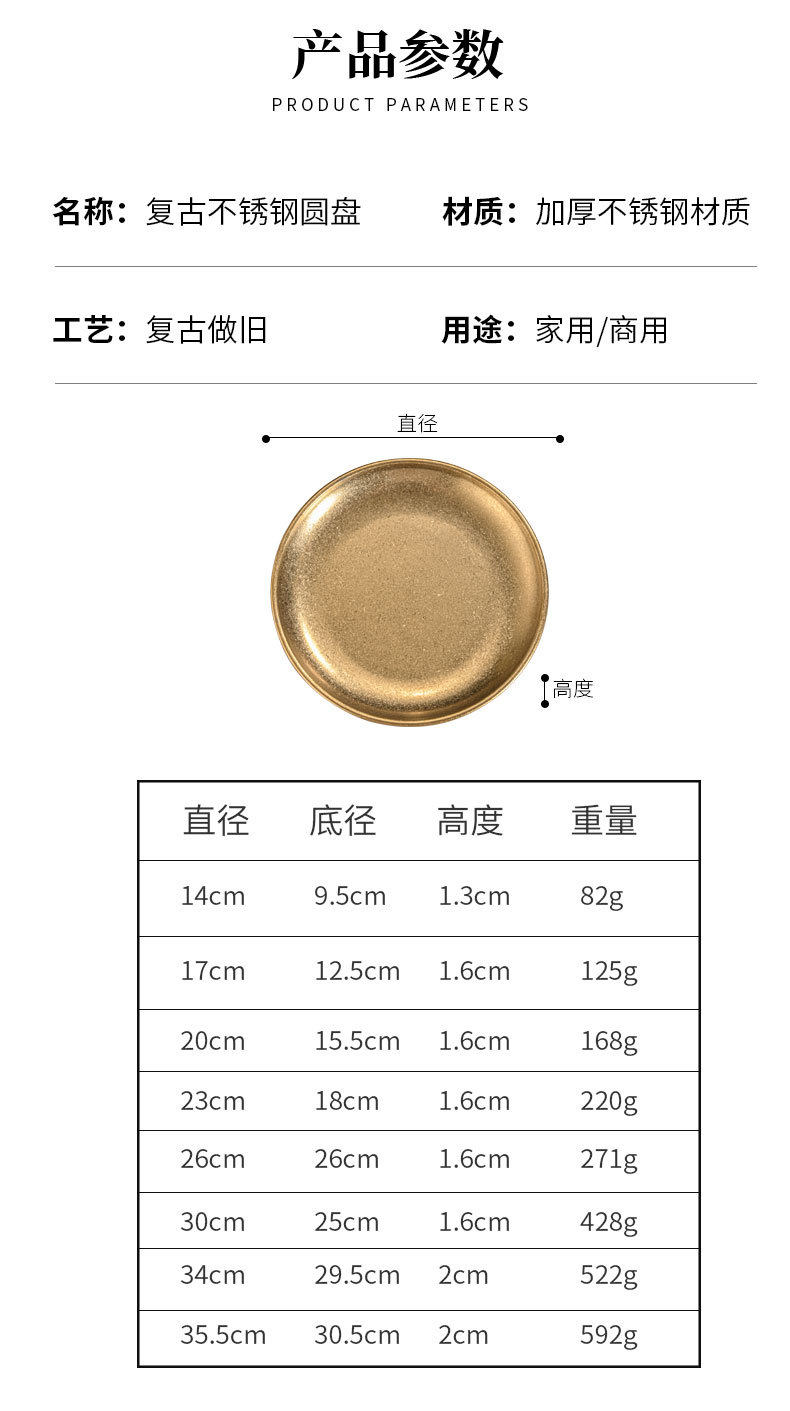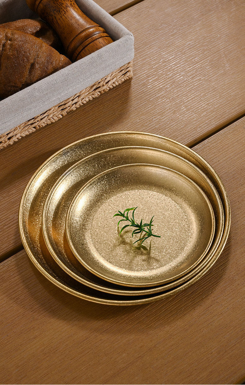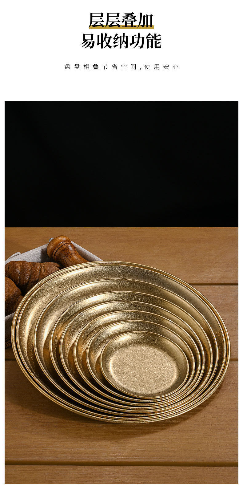 韩式不锈钢圆盘ins做旧咖啡厅托盘水果盘甜品浅盘平底碟复古餐具